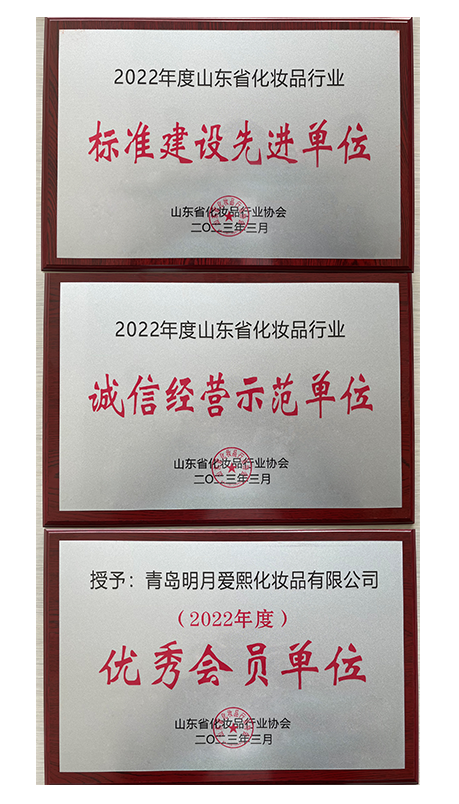 在本次大會(huì)上,青島明月愛熙化妝品有限公司斬獲“標(biāo)準(zhǔn)建設(shè)先進(jìn)單位”、“誠信經(jīng)營示范單位”、“優(yōu)秀會(huì)員單位”三項(xiàng)殊榮。